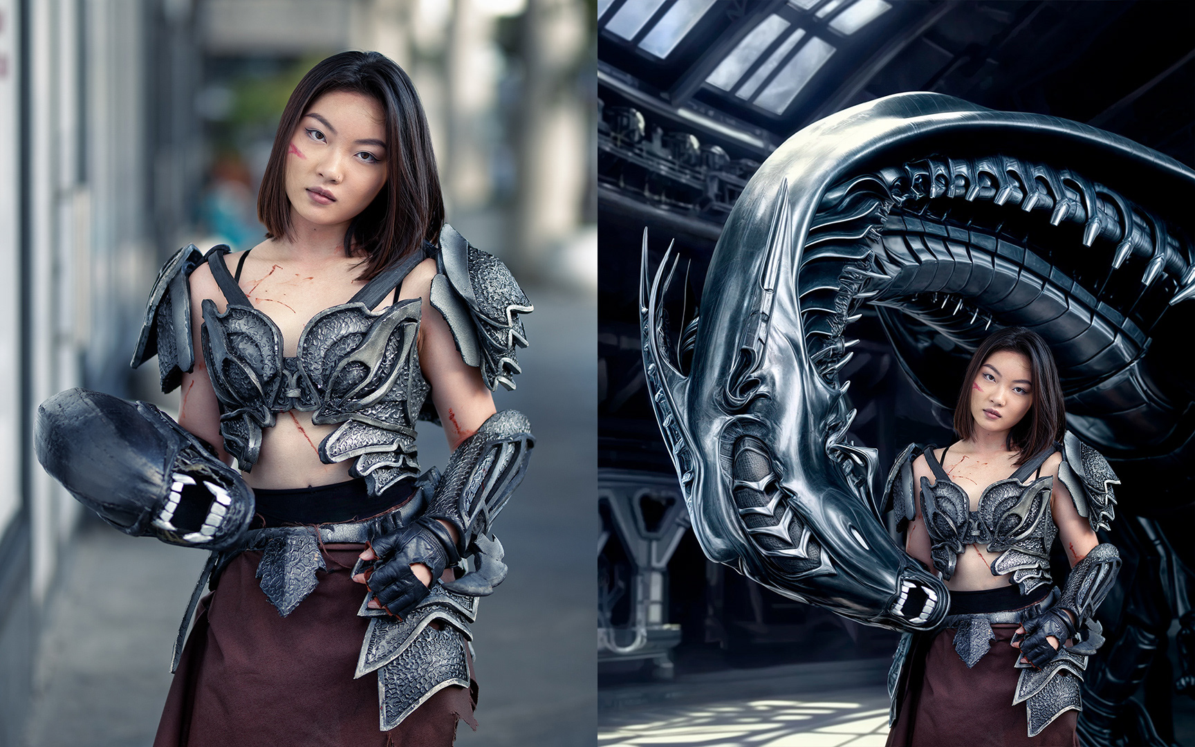 Je fais de temps en temps des photos de cosplay et j'ai toujours voulu intégrer les personnages que je photographie dans des décors qui correspondent à leur thème. Voici un exemple avec une photo réalisée dans la rue. En utilisant l'inpainting assisté par IA, puis en peaufinant les détails sous Photoshop pour éliminer les incohérences, j'ai obtenu un résultat assez satisfaisant pour un premier essai. Ce n'est pas encore parfait, mais c'est encourageant et cela ouvre de nouvelles possibilités vraiment intéressantes.
