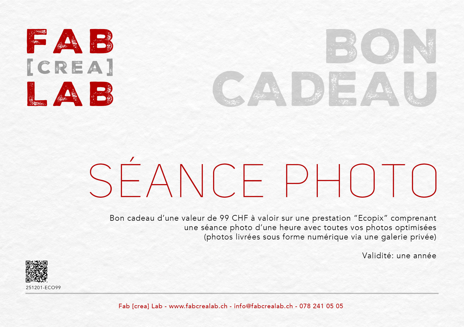 1 heure de prises de vue pour 99 CHF, avec toutes les photos optimisées, livrées en 24h via une galerie privée en ligne.
